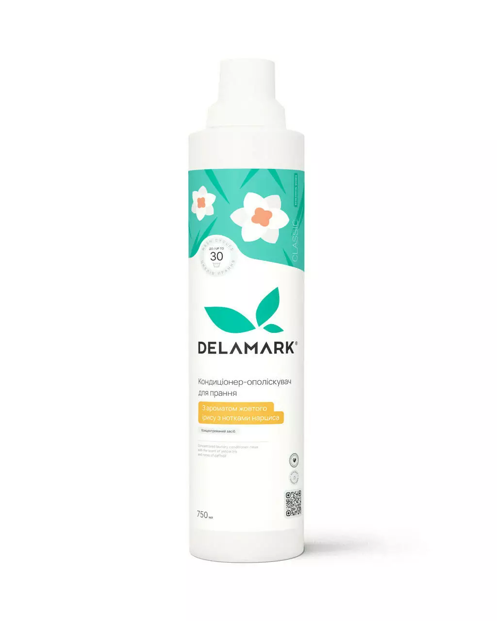 Кондиціонер-ополіскувач DeLaMark Royal Powder з ароматом жовтого ірису та нотками нарциса — екологічний концентрований засіб для завершального етапу прання. Має безпечний для людини та природи склад. Робить випрані речі ніжними та м'якими. Полегшує прасування, не дає речам електризуватися й має легку дезінфекційну дію.