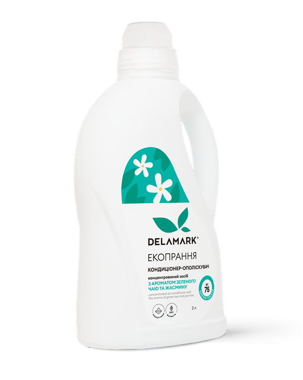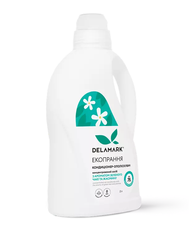 Кондиціонер-ополіскувач DeLaMark з ароматом зеленого чаю й жасмину — екологічний концентрований засіб для завершального етапу прання. Має безпечний для людини та природи склад. Робить випрані речі ніжними та м'якими. Полегшує прасування, не дає речам електризуватися й має легку дезінфекційну дію. Надає білизні ніжного аромату.
