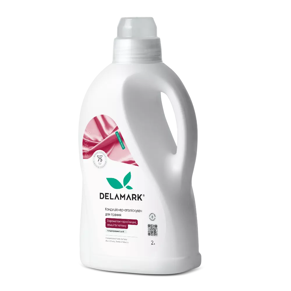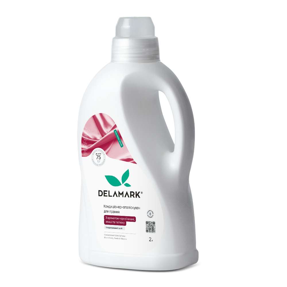 Концентрований безфосфатний кондиціонер-ополіскувач DeLaMark з ароматом чорної вишні, замші та тютюну призначений для остаточного етапу машинного та ручного прання речей всіх кольорів будь-якого типу тканини.