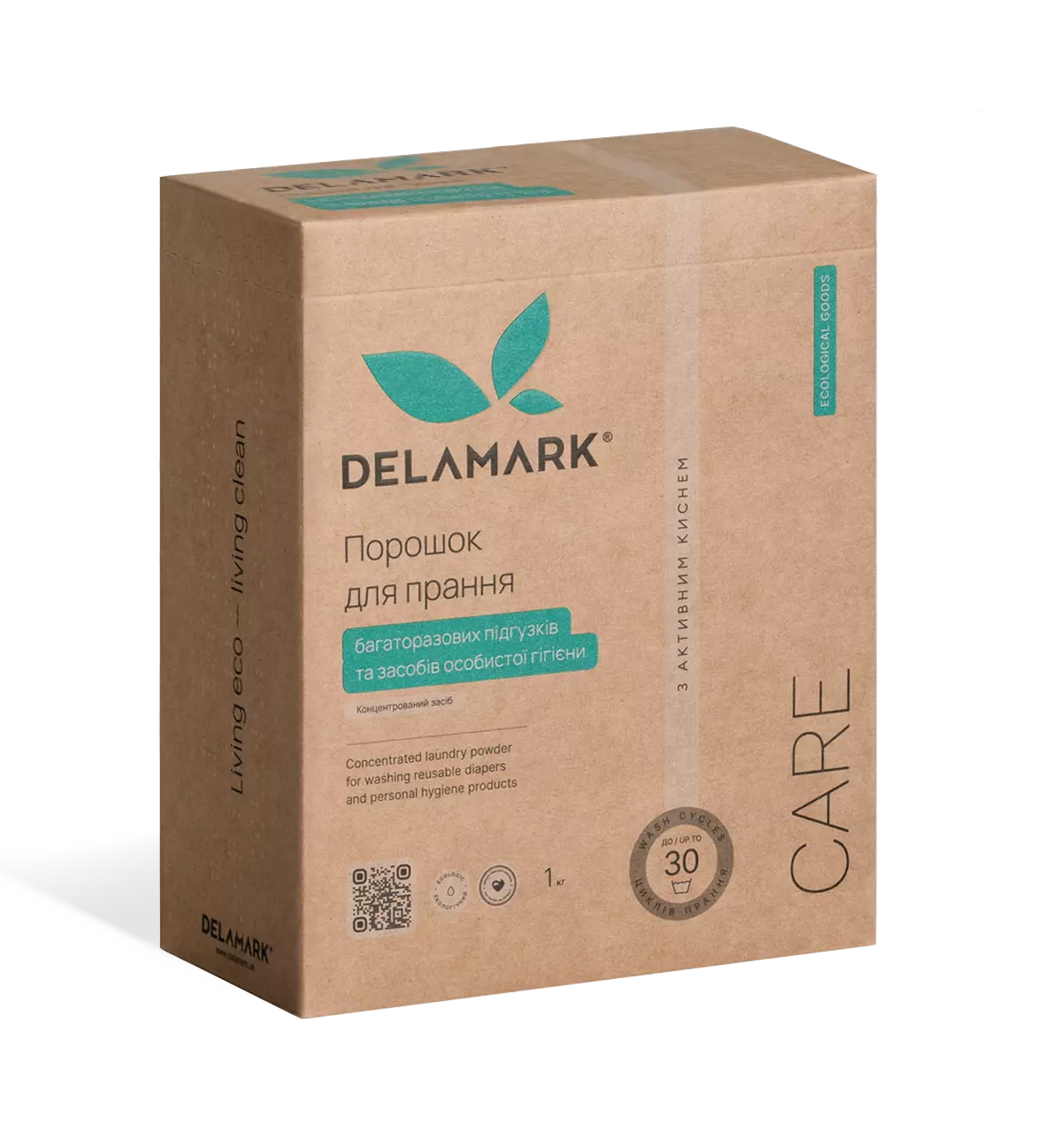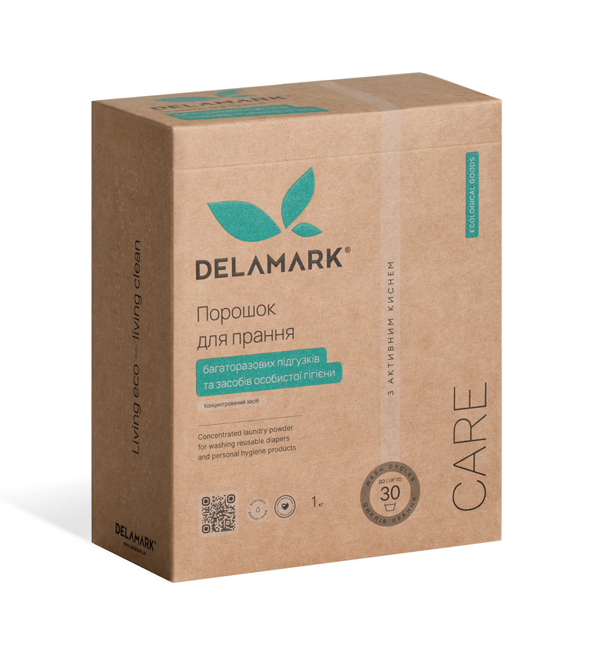 Концентрований кисневий безфосфатний пральний порошок DeLaMark для прання багаторазових підгузків та багаторазових засобів особистої гігієни розроблений технологами міжнародного рівня, щоб одночасно досягти трьох цілей: ефективно прати, не шкодити людині та дбайливо ставитися до природи.