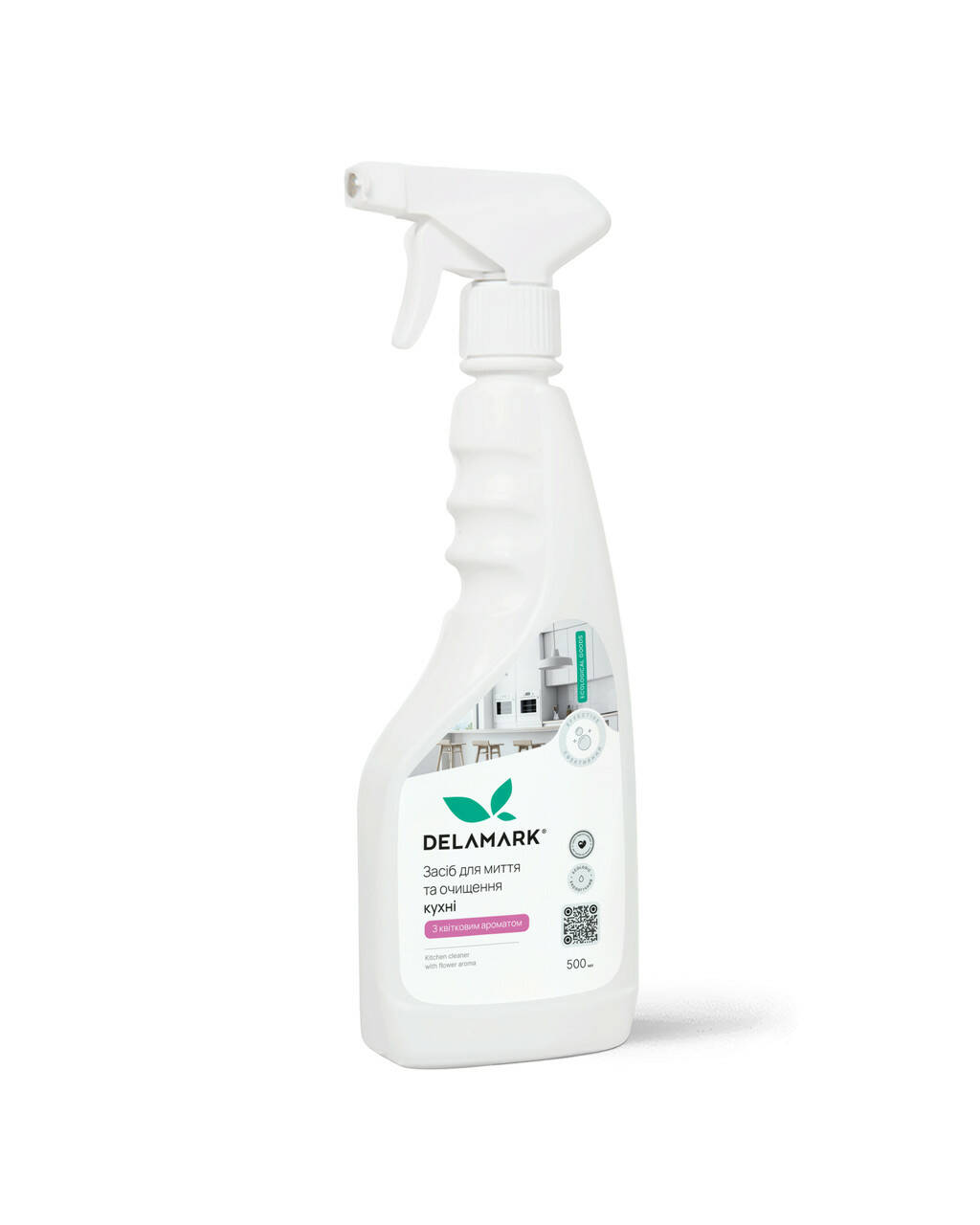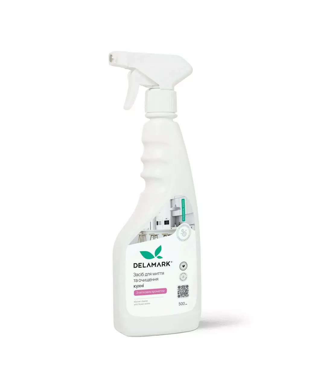 Засіб для миття й очищення кухні DeLaMark з квітковим ароматом дуже економний, легко наноситься, добре змивається й має зручну упаковку з розпилювачем