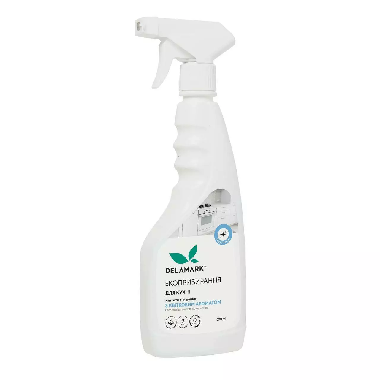 Засіб для миття й очищення кухні DeLaMark з квітковим ароматом дуже економний, легко наноситься, добре змивається й має зручну упаковку з розпилювачем